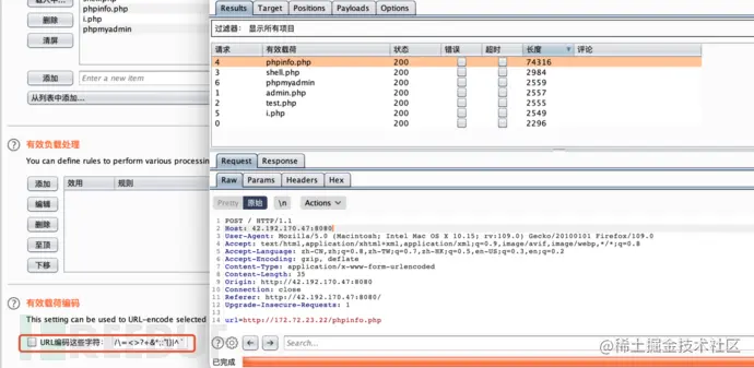 2. 使用burp的Intruder模块对网站进行目录爆破,存在phpinfo.php和shell.php。注意:此处需要去除特殊字符编码。