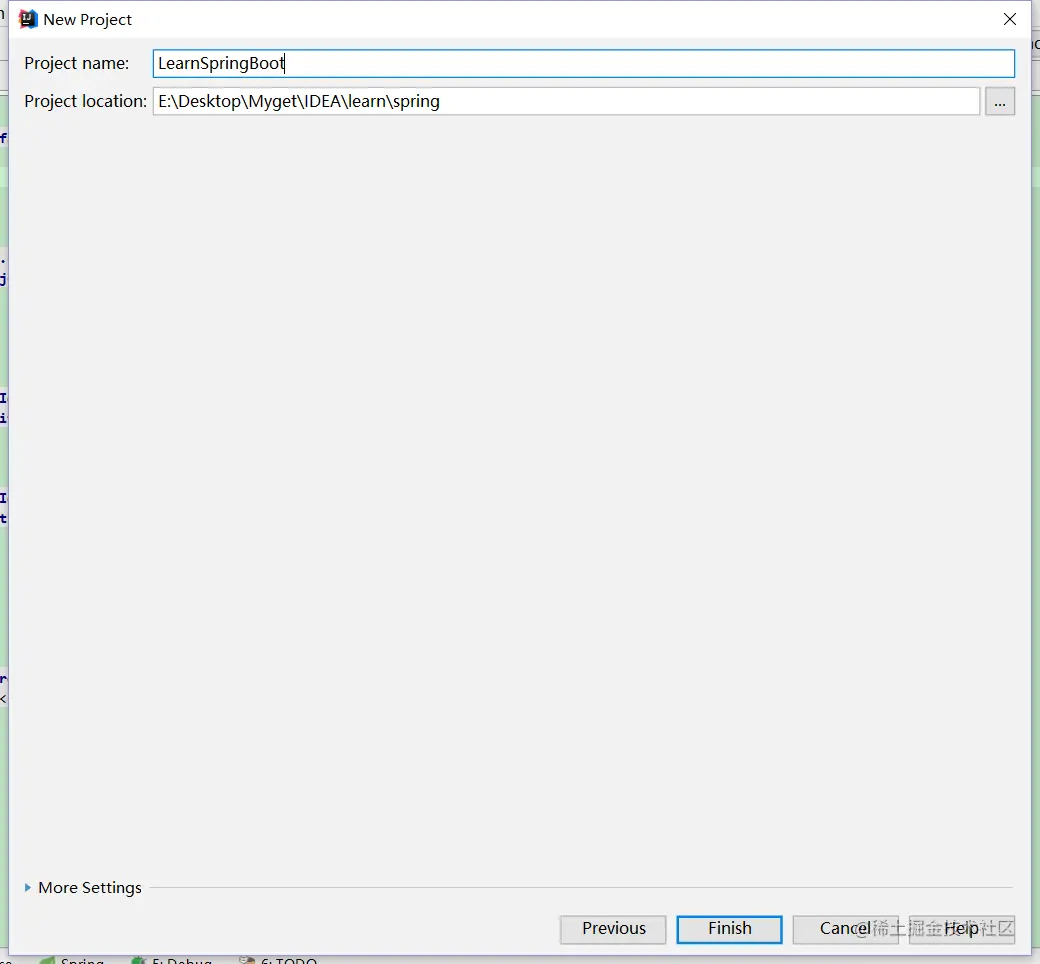 5、Project name,给项目命名,可任意;Project location,项目存储的区域,可以事先建一个文件夹用以提供存储。点击 Finish 完成创建。