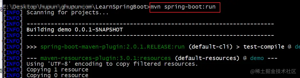 由于使用了 spring-boot-starter-parent POM, 这样我们就有了一个非常有用的run目标,我们可以用它启动程序。进入命令提示符后,进入项目根目录,输入 mvn spring-boot:run 来启动应用: