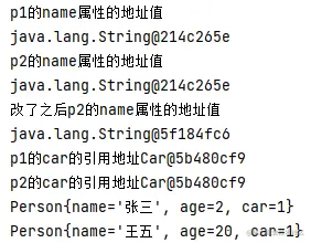System.out.println("改了之后p2的name属性的地址值");//注意:浅拷贝里,若变量为String字符串,则拷贝其地址引用。但是在修改时,它会从字符串池中重新生成一个新的字符串,原来的对象保持不变。