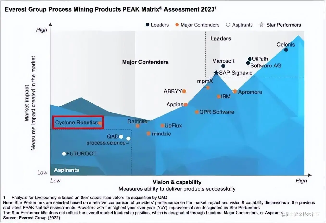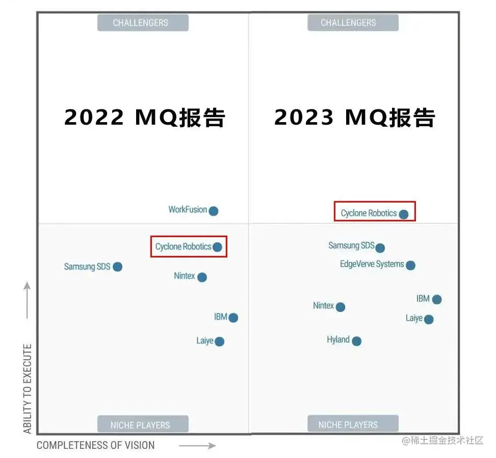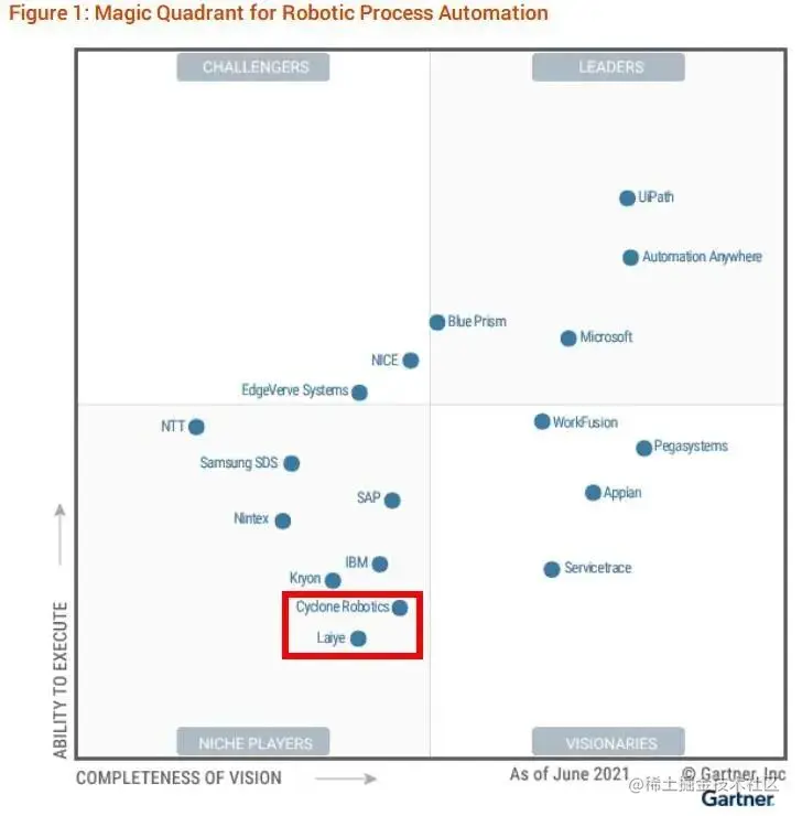 这是Gartner连续第五年发布此报告,也是国产RPA厂商连续第三年入选该报告。今年的报告仍有两家国产厂商入选,其中弘玑Cyclone更成为整个报告变动最大且最耀眼的厂商,完成了从利基市场参与者到挑战者的跨象限跃升,实现华丽蜕变。