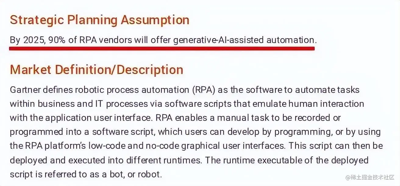 Gartner基于对ChatGPT等生成式AI与RPA融合趋势及大语言模型(LLM,Large Language Model)的深度研究,在报告开头的“战略规划设想”板块就给出了预测:到2025年,90%的RPA供应商都将提供生成式AI辅助的自动化服务。