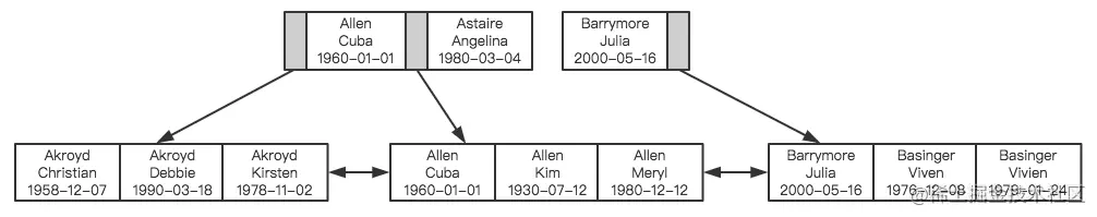 可以看到,索引首先根据第一个字段来排列顺序,当名字相同时,则根据第三个字段,即出生日期来排序,正是因为这个原因,才有了索引的“最左原则”。