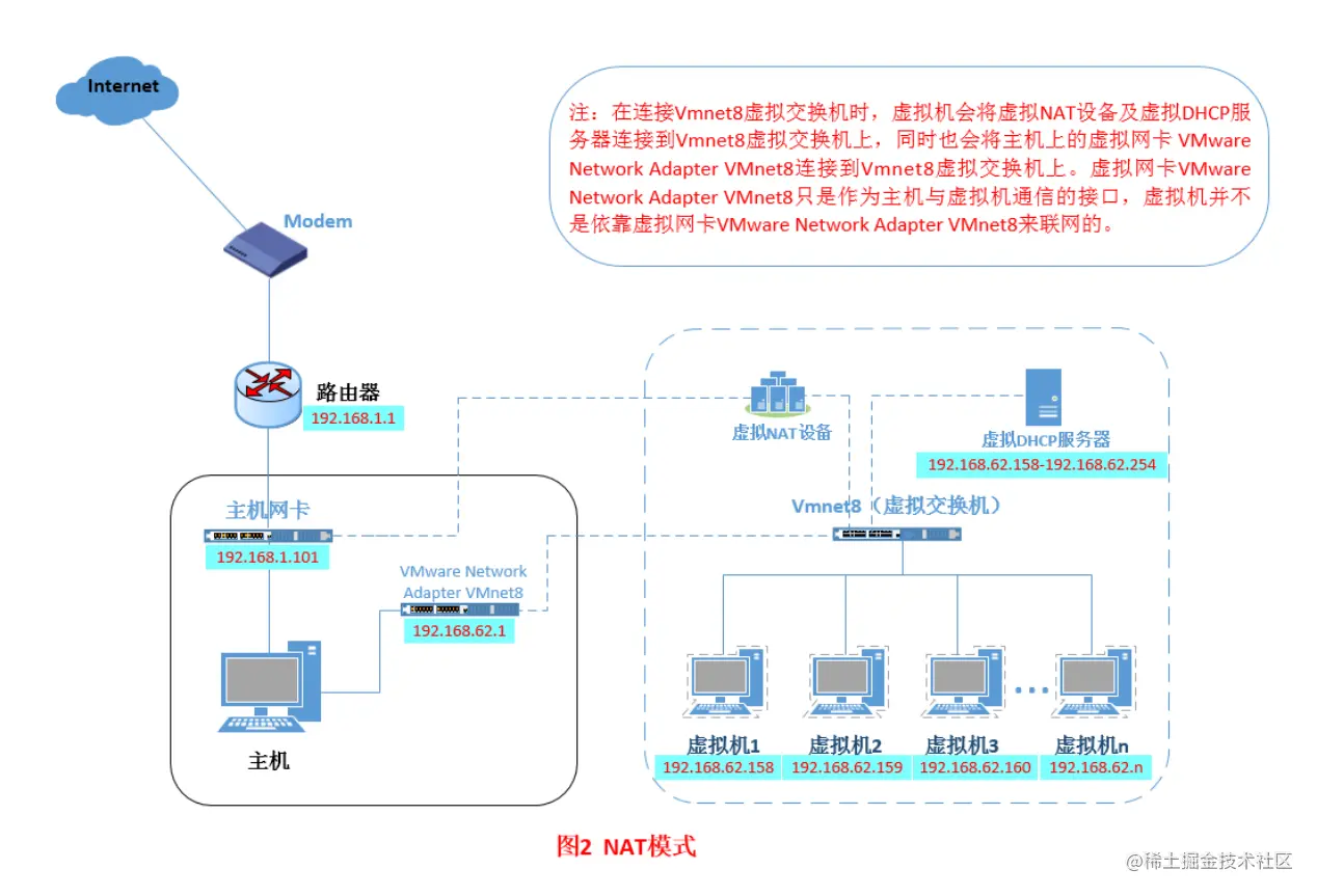 虚拟机向 vmnet8 虚拟交换机上发广播,虚拟交换机上搭了虚拟 DHCP 服务器,虚拟的 DHCP 服务器会给虚拟机分配没有被分配的 IP,虚拟机找到 IP 后会再告知虚拟服务器,服务器,再给虚拟机回确认确认 IP 分配信息并且将 IP 的详细信息发给虚拟机。