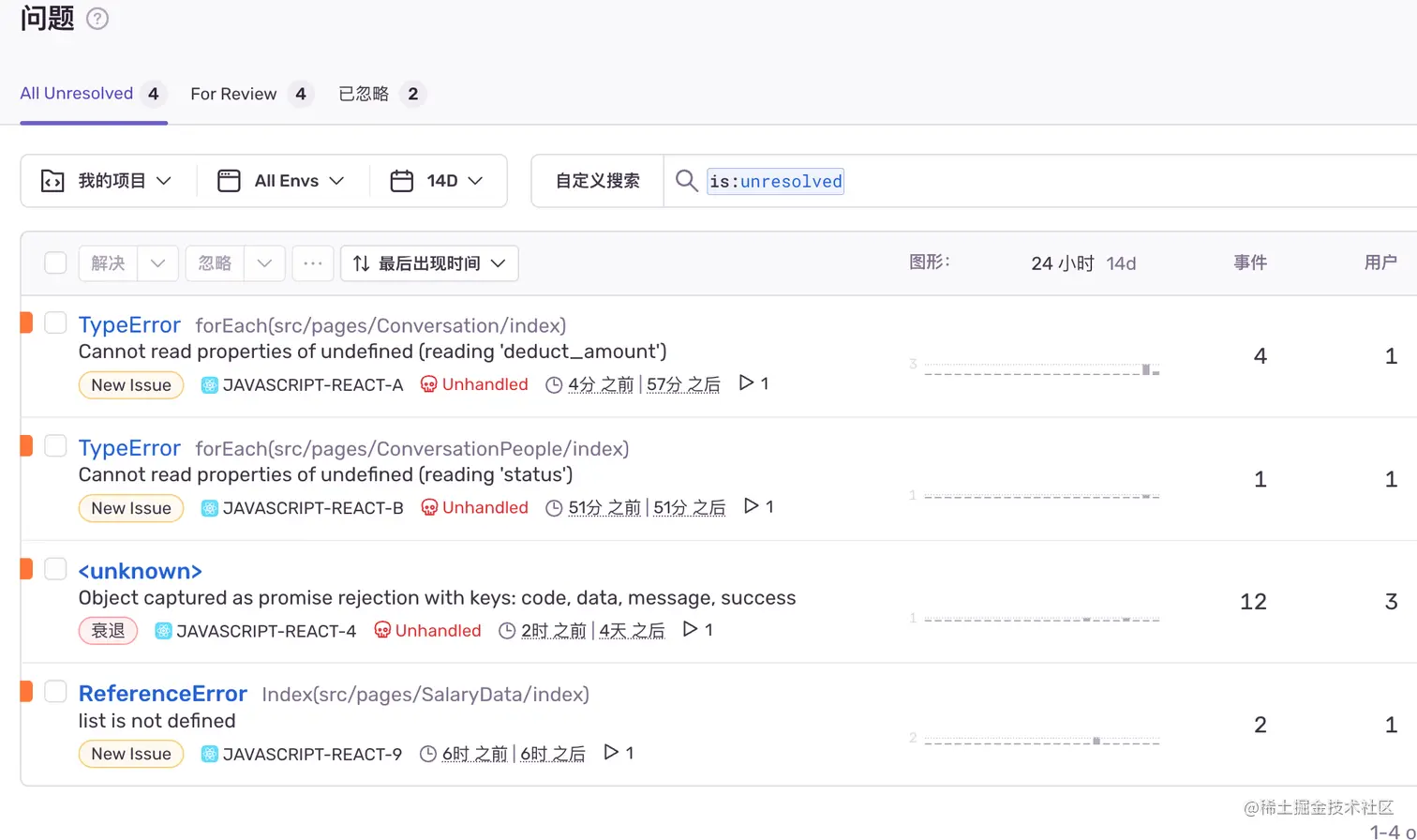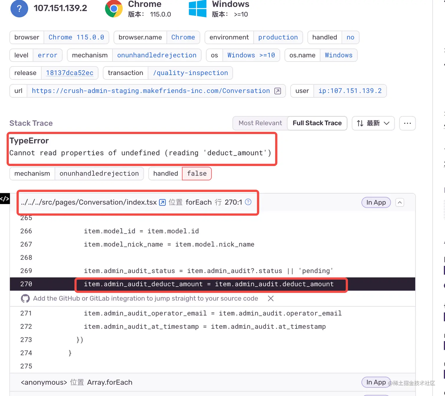 异常信息:抛出异常的 error 信息,Sentry 会自动捕捉。
