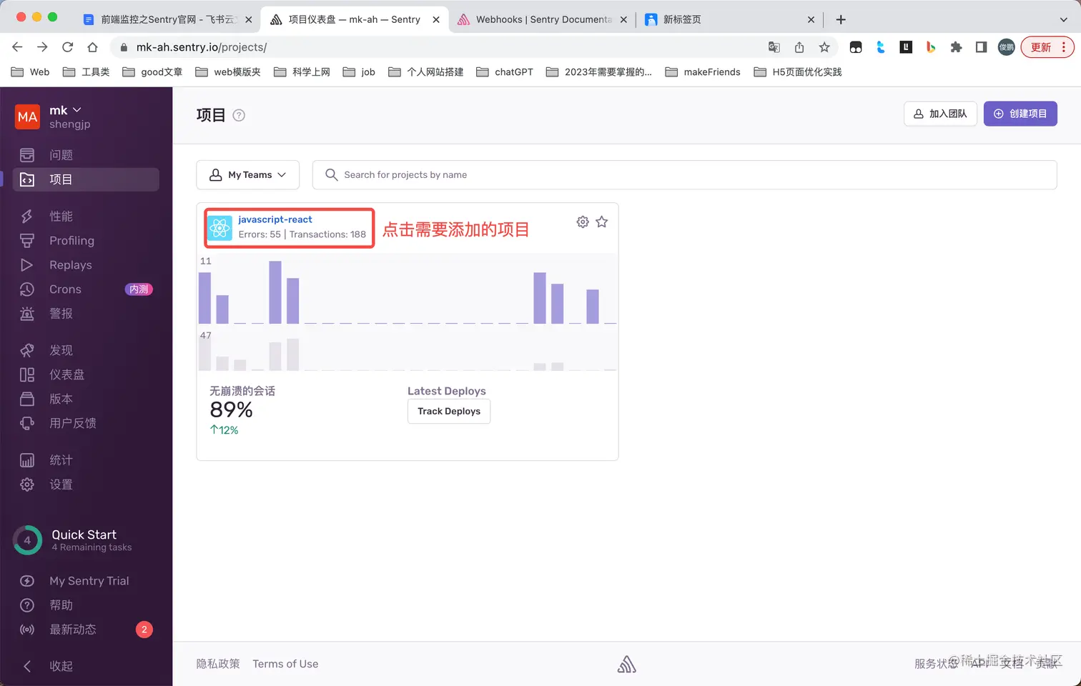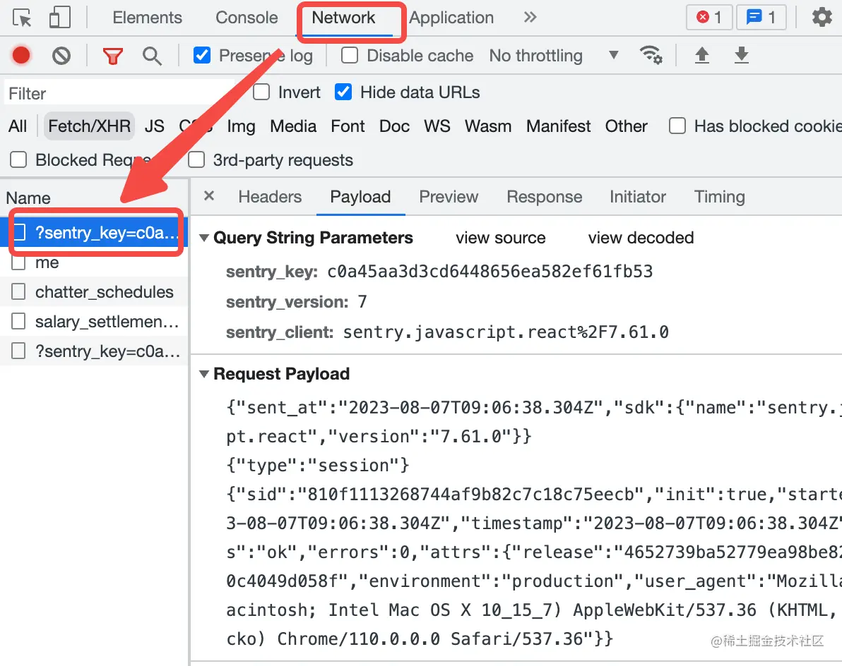 然后保存,刷新浏览器,在请求中可以看到 sentry 对应的请求了,此时代表项目安装sentry好了