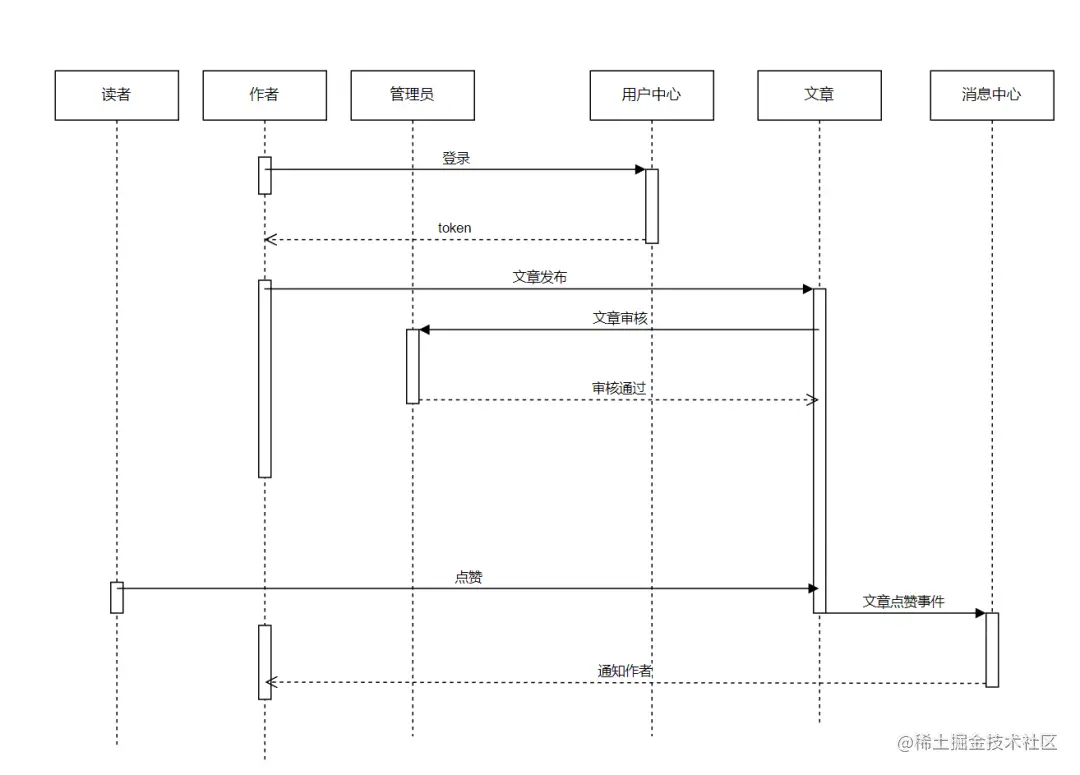 对于技术派的核心玩法,在于作者发布文章,读者阅读文章;整体交互相对清晰简单,实际上这一块是可以省略的;当然我这里也补上这个流程,主要以文章发布,到读者阅读文章,并点赞,作者获取通知这个流程,来串一下这个系统的整体交互流程