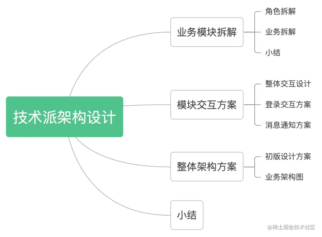 上面的流程走完之后,接下来就是敲定整体的架构方案,通常一个好的架构方案一张图就完事了,注意越是前期在意的越不是细节
