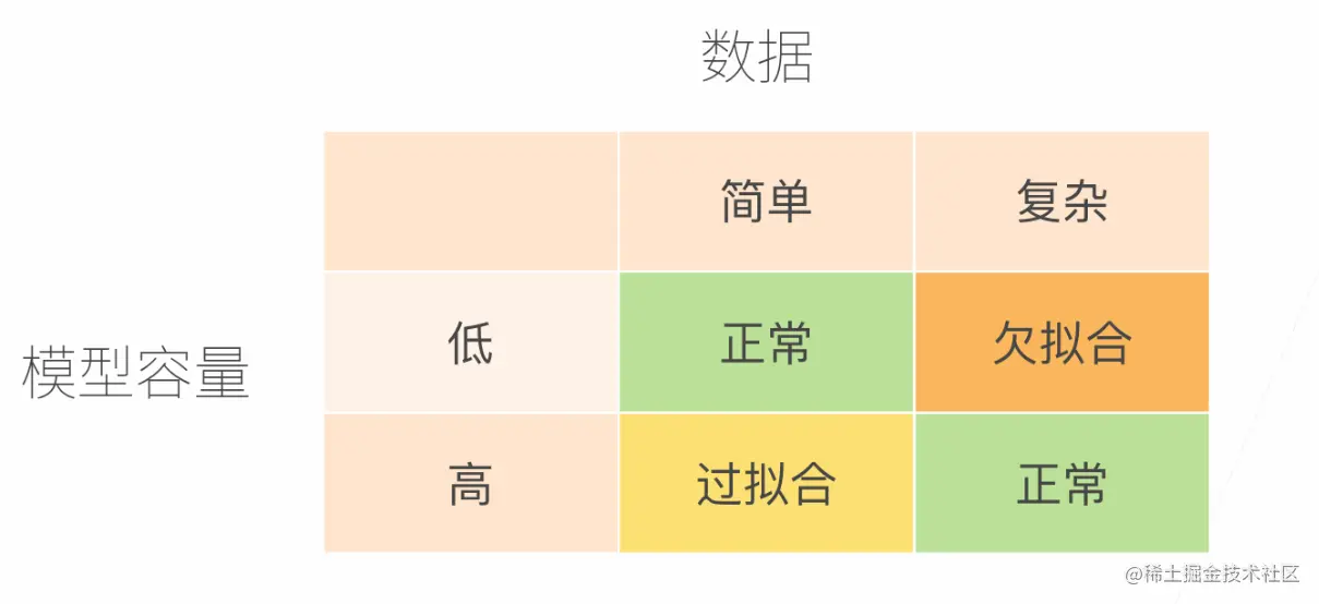 模型容量过低:当模型容量不足以表示数据中的复杂模式时,模型会出现欠拟合现象,无法很好地拟合训练数据。