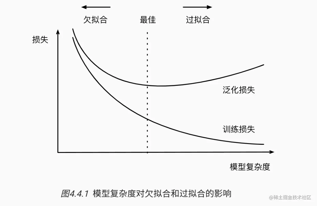 当模型容量比较低的时候,训练损失、泛化误差比较高;随着模型容量的增加,训练损失在不断减少。但是并不是模型容量越高越好,越高意味着复杂度越高,意味着记住更多的信息,意味着记录大量的噪音,这会导致模型去拟合噪音,导致泛化误差变大,需要把握这个度。