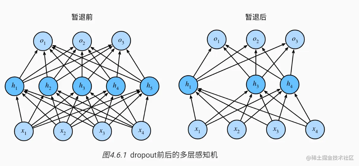 借用沐神的例子。我们要利用模型来帮银行找出没有能力还贷款的人。在以往的数据中(训练数据),五个没还贷款的中有3个是穿蓝色衣服的(可能是蓝领),然后模型就会记住这个现象,并且传递给下一层。但是这只是个现象,人家有可能就是单纯穿个蓝色衣服而已,明天就换一个其他颜色的衣服了。Dropout后,可以减轻后面层对衣服这个依赖项,随机丢弃一些特征,无法传递到下一层。可以使模型泛化能力更好点。