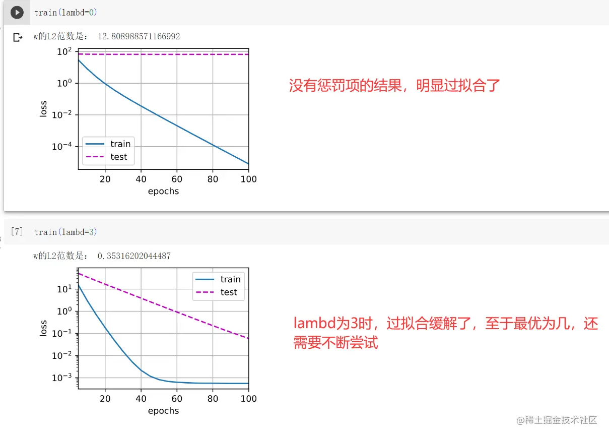 l = loss(net(X),y) + lambd * l2_penalty(w) #新的损失函数为 损失函数 + 惩罚项