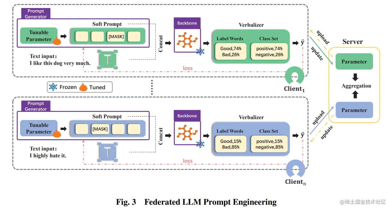 最后,为了应用 Prompt 技术增强模型的上下文学习与处理复杂任务的能力,作者提出了一种联邦 LLM 提示工程方法,在敏感数据上生成 Prompt 的同时确保隐私被保护。从下图可以看到,从客户端到服务端传递的参数只涉及 Prompt 与文本的相互关系,并不包含任何输入特征的嵌入。同时,在联邦 Prompt 工程中,作者采用了 Soft Prompt(Prompt 在模型的嵌入空间中执行),Soft Prompt 完美适配联邦学习的背景要求增强了联邦学习与大模型的协同作用。
