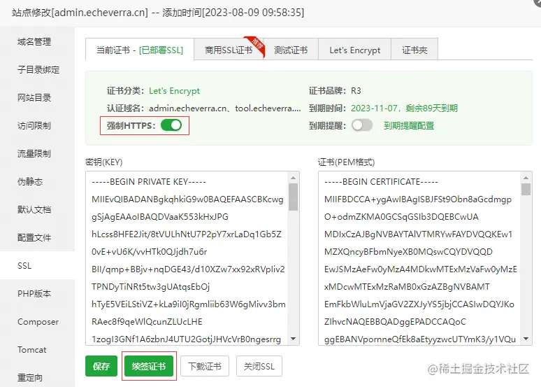 申请成功后可以强制HTTPS,也可以续签证书,延长到期时间。