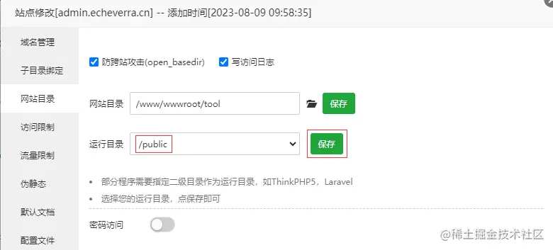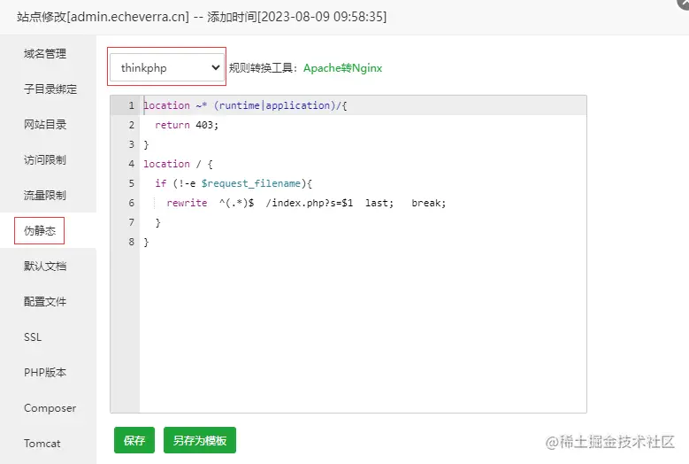 因为项目使用的是 ThinkPHP 框架,所以要设置伪静态,选择 thinkphp,然后保存。