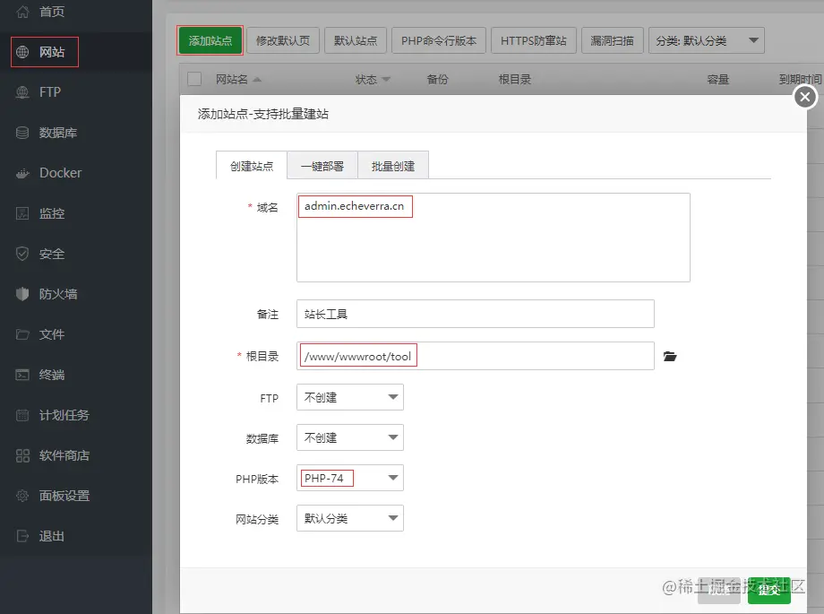 在宝塔菜单网站中添加站点,域名填写你的后台域名,根目录选择 /www/wwwroot/tool,PHP 版本选择 PHP-74。