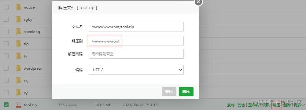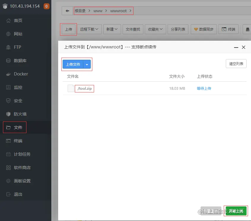 拿到源码后,将 tool.zip 压缩文件通过宝塔上传到目录 /www/wwwroot。