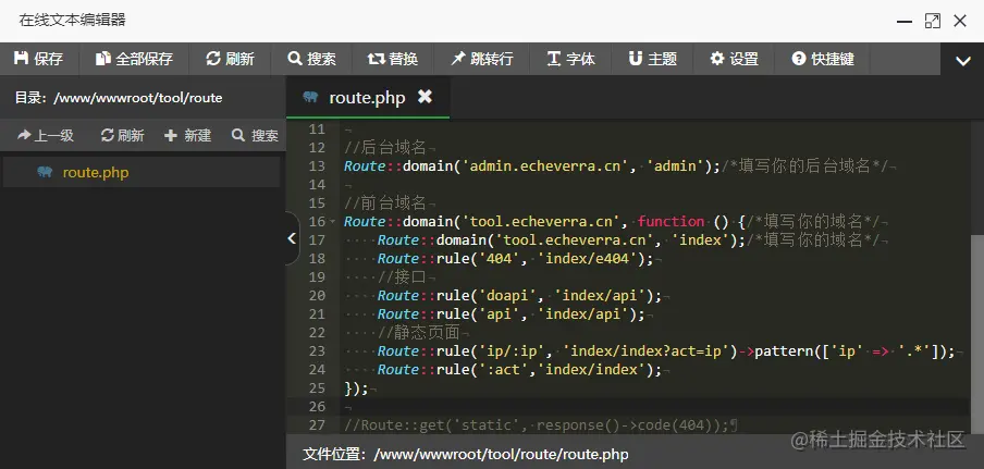 首先需要修改前后台域名,修改文件 tool/route/route.php。
