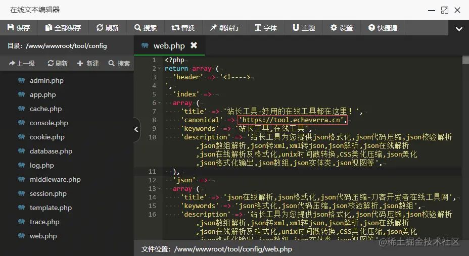 在修改网站首页链接,修改文件 tool/config/web.php,将 tool.echeverra.cn 替换成你的前台域名。