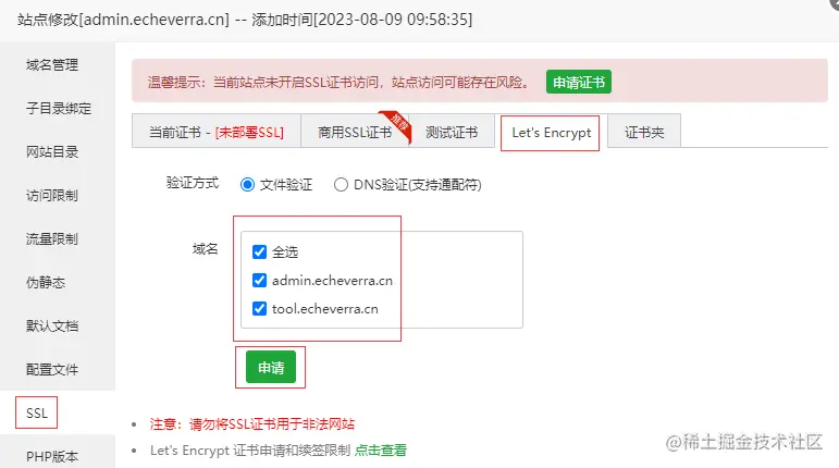 最后是申请 SSL 证书,这样可以通过 https 方式访问,当然不申请也没关系。SSL 菜单选择 免费的 Let's Encrypt,选择全部站点申请即可。