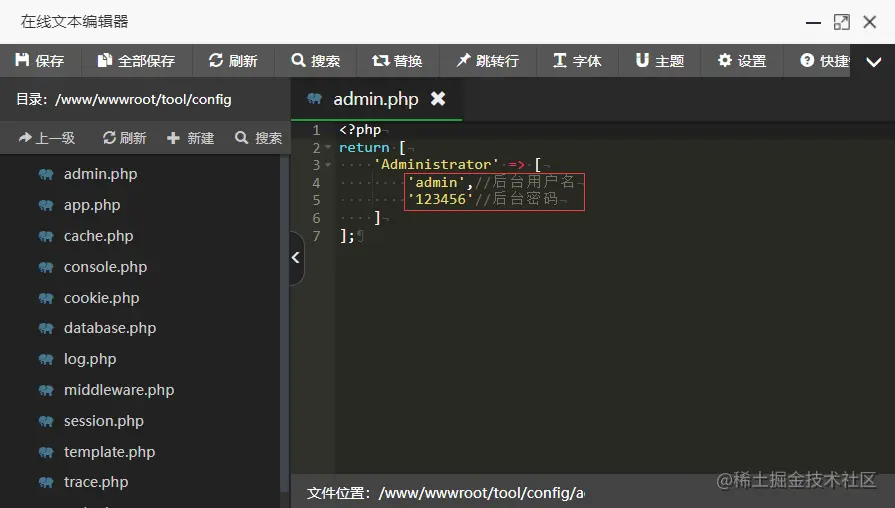 然后是配置后台管理员账号,修改文件 tool/config/admin.php,定义好自己的后台用户名和密码,默认是 admin / 123456。