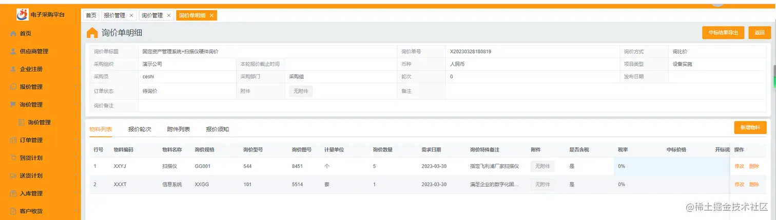 一款全源码可二开,可基于云部署、私有部署的企业级数字化采购管理系统,供应商全生命周期管控,公开询价管理,招标,定标,评审,生成订单,送货,收货全流程管理,让企业采购全程数字化管控,助力企业全面提升效率与效益。电子化采购全闭环管理,打造企业高效透明采购平台。源码获取,平台私信。