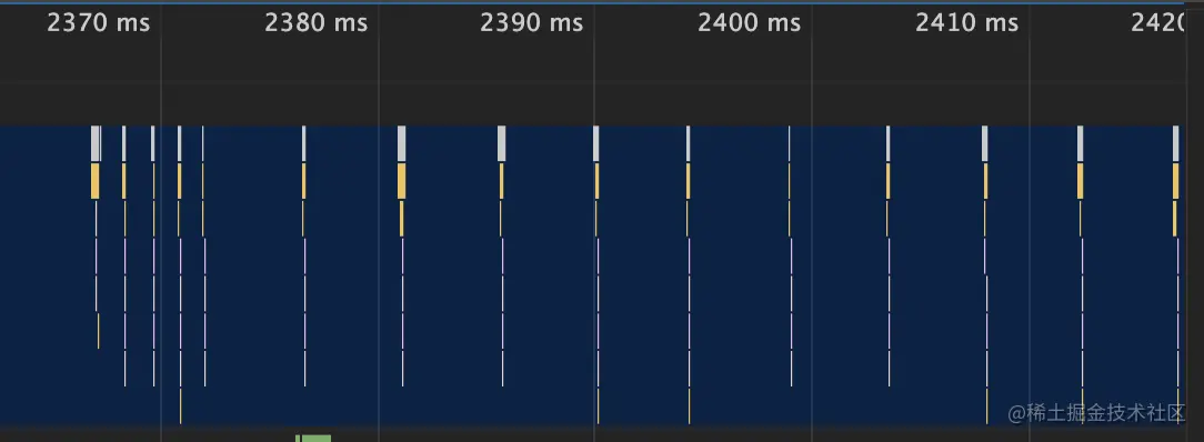 图中的竖线就是定时器的函数回调过程,可以看出前面五次调用的时间间隔比较小,嵌套调用超过五次以上,后面每次的调用最小时间间隔是 4 毫秒。
