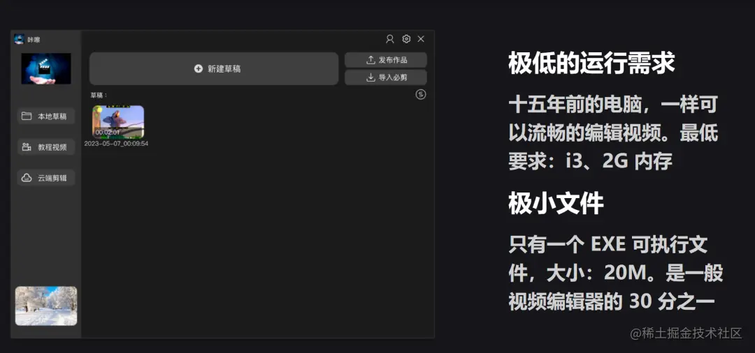 针对目前客户端播放数据量越来越大,我写了一个浏览器版本的视频编辑器,意思是浏览器可以直接被当作视频编辑器,免去用户安装,打开浏览器就可以直接进行视频编辑。而且,现在电脑上安装的软件越来越少了,好像只剩下了浏览器。因为浏览器能够完成的事情越来越多,有它就够了。 另外现在网上下载的软件不安全,可能会中毒。视频编辑器作为一个重度使用工具,用户对性能,流畅度要求很高,目前很少有纯前端的网页版视频编辑器。所有的云剪辑都是先上传视频文件,后端转码后(分辨率变小)再编辑。上传耗时,担心隐私,视频模糊等,用户体验很差。咔嚓的界面和内核都是跨平台的,网页版本只是重新编译而已。所以和本地安装软件差不多。**不需要上传视频,功能和本地的一模一样。**这样用户只要打开网页就可以和本地软件一样的使用体验。