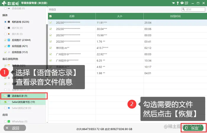 第4步:勾选【语音备忘录】中想要恢复的内容,然后点击【恢复】就可以找回语音了。