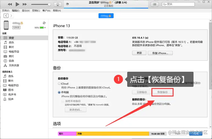 第3步:在【设置】菜单栏下找到【摘要】,然后点击【恢复备份】,iTunes将会从您的电脑备份中恢复您的iPhone数据,包括语音备忘录。