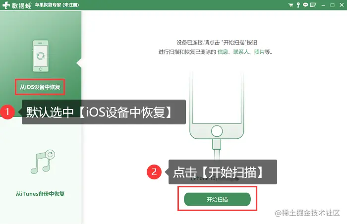 第2步:默认第一种方式【从iOS设备中恢复】,然后点击【开始扫描】。