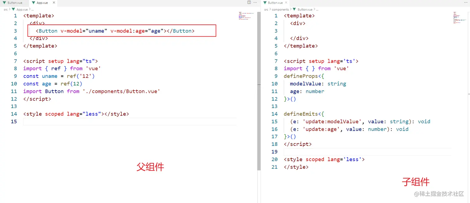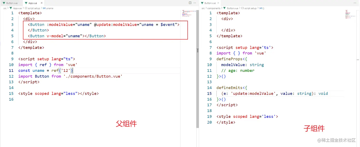 满足以上条件就可以简化成v-model了 <Button :modelValue="uname" @update:modelValue="uname = $event">