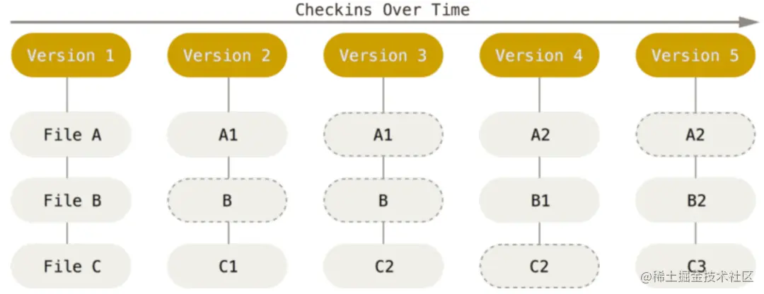 如果文件有改动,则存储新的快照,如果文件无修改,git不会重新存储该文件,而是直接指向之前存储的文件。