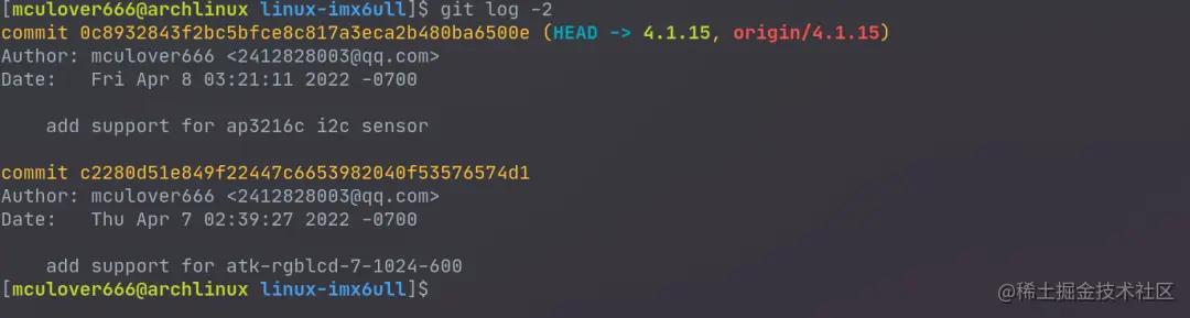 还有一个-<n>选项,可以用来指定查看最近的几次提交,比如只查看最近的两次提交: