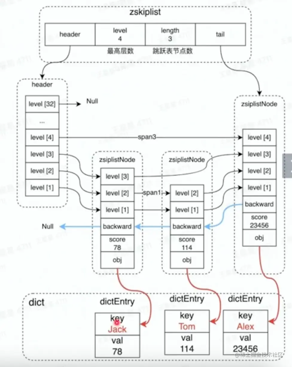 - Hash Table: The hash table stores the elements of the zset as keys and their scores as values. This allows for O(1) time complexity when fetching an element's score.