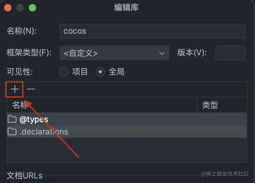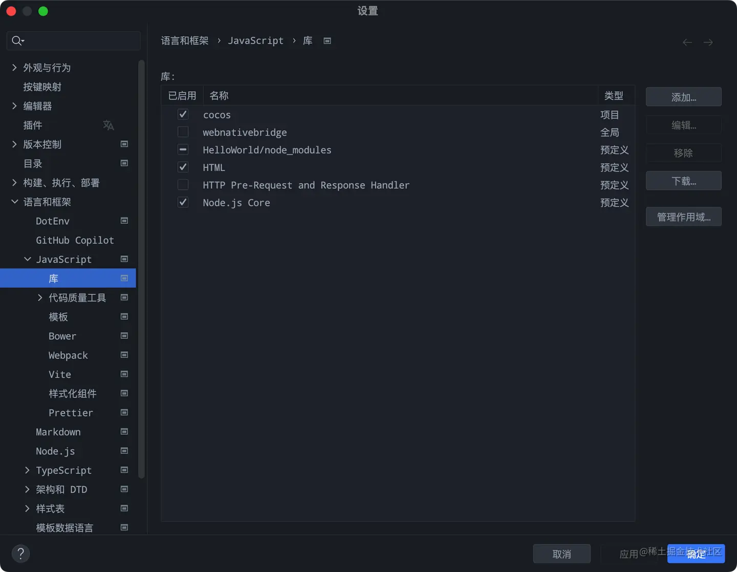 所以我们可以手动创建cocos库声明,并且在该项目上面启动即可。具体操作步骤如下,打开 Webstorm -> Settings -> 语言和框架 -> Javascript -> 库,点击右侧的添加按钮,进行如下配置: