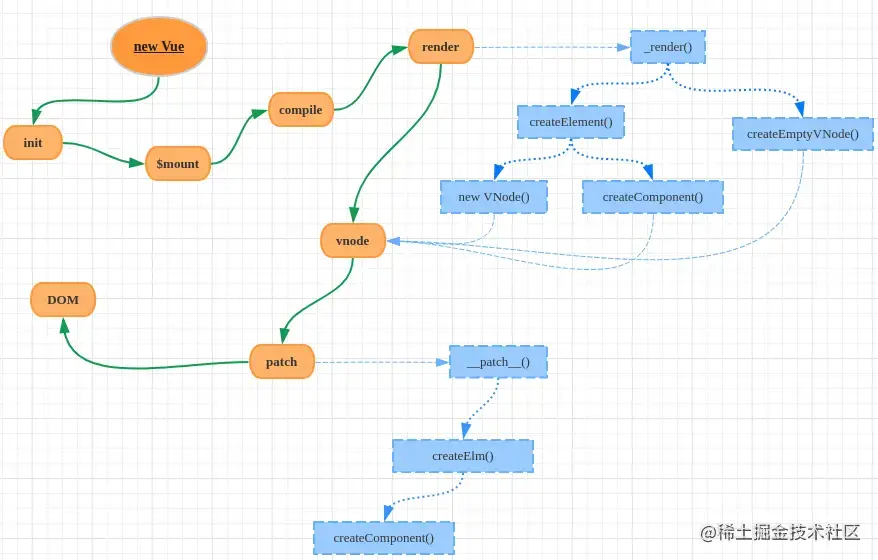 _render函数将组件对象转化为一个VNode实例;而_render是通过调用createElement和createEmptyVNode两个函数进行转化; createElement的转化过程会根据不同的情形选择new VNode或者调用createComponent函数做VNode实例化;- 完成VNode实例化后,这时候Vue调用原型上的
