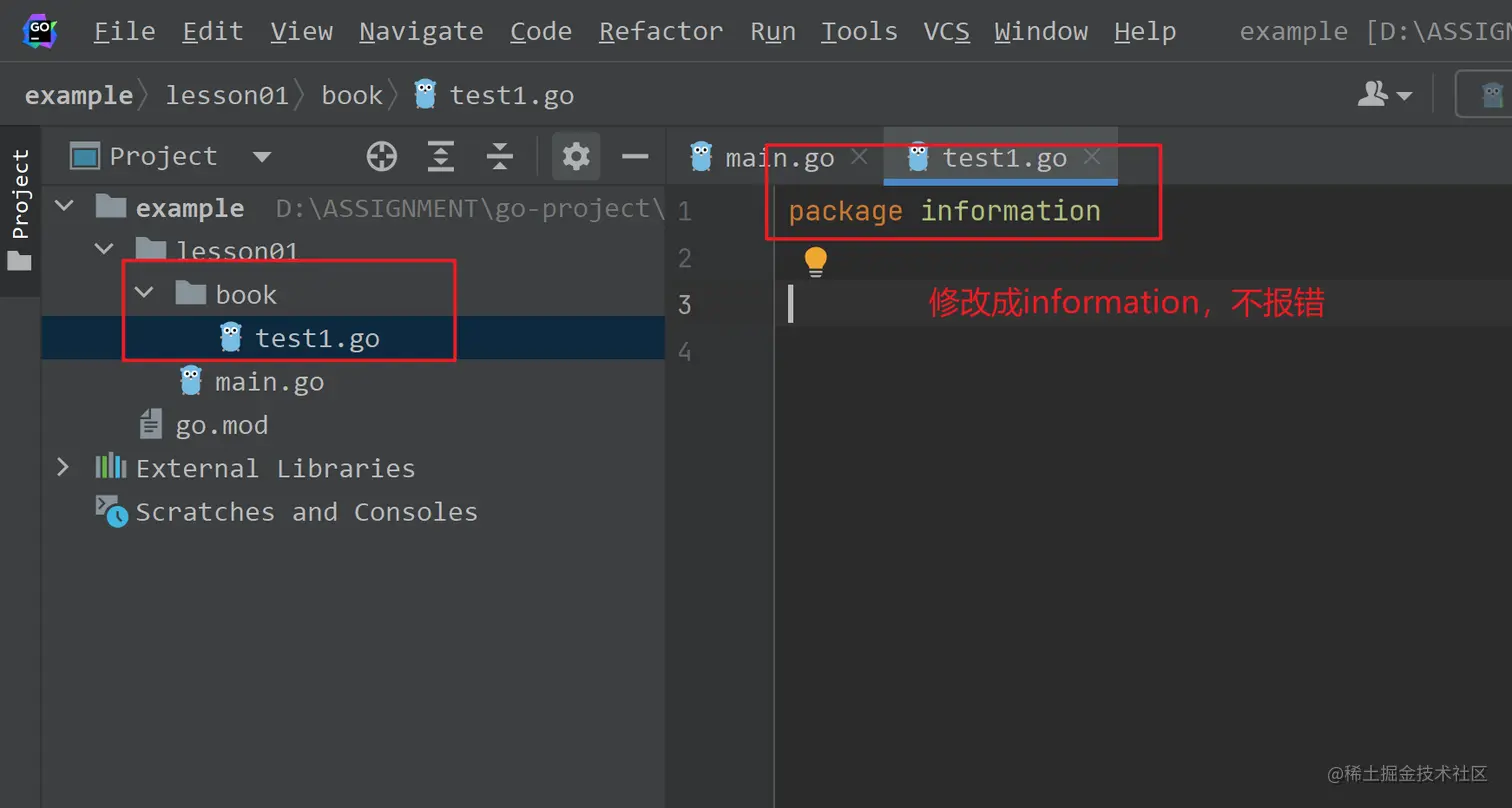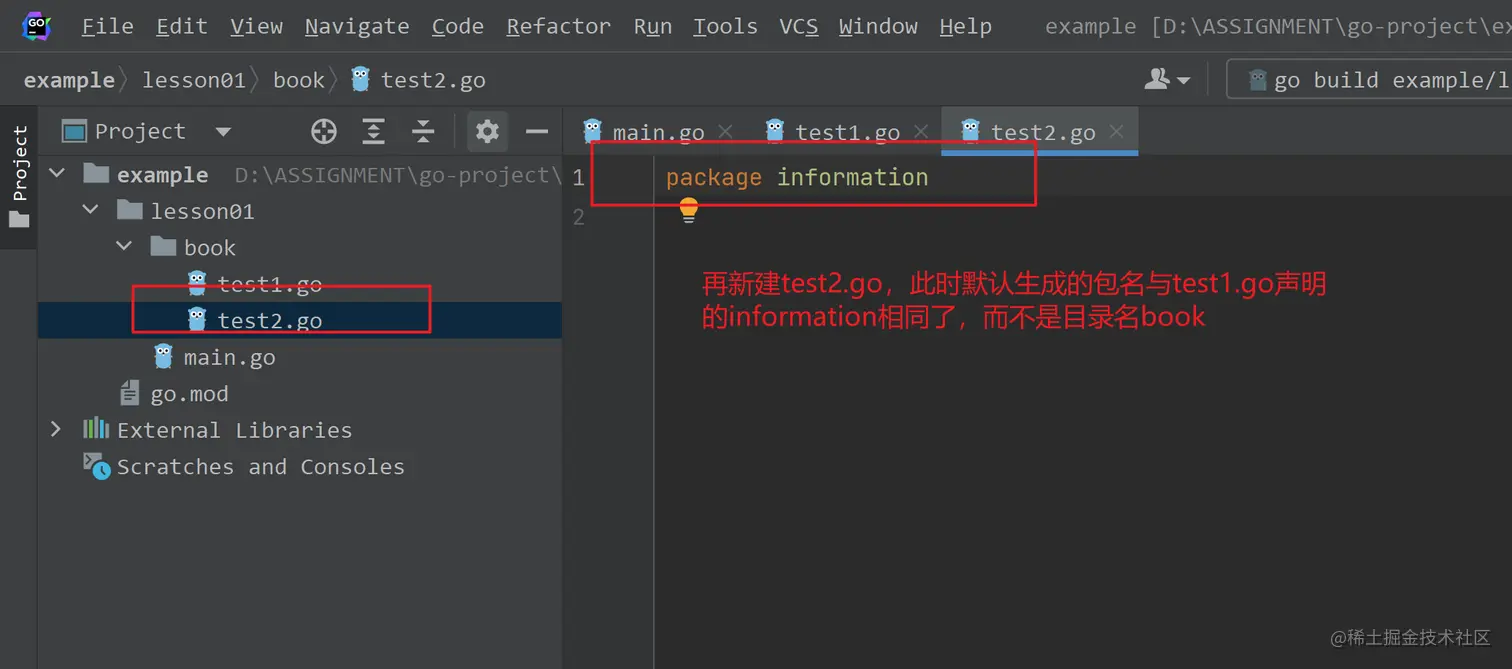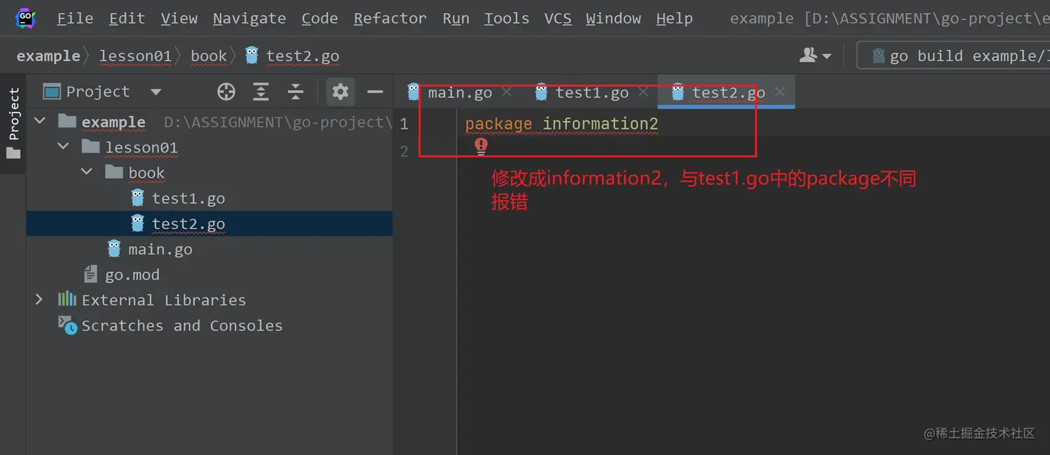 不过,一个go文件声明的包名也可以与其目录名不一致,但同一个目录下的go文件声明的包名必须一致: