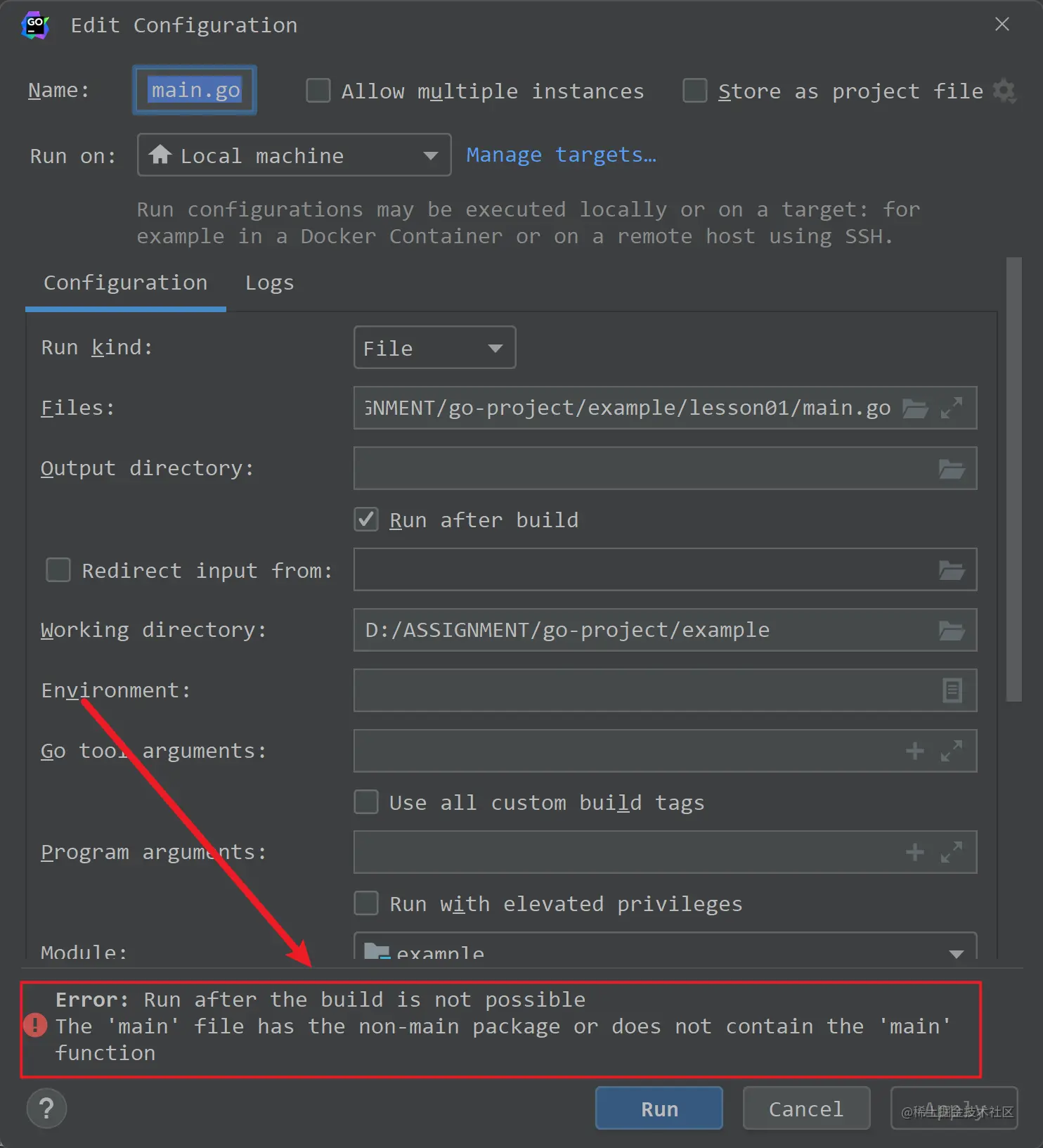 如果执意运行,GoLand会弹出下面的界面,提示没有入口包main(若用命令行执行则会报错):