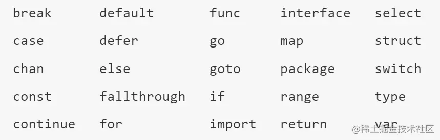 Go语言中关键字有25个,关键字不能用于自定义名字: