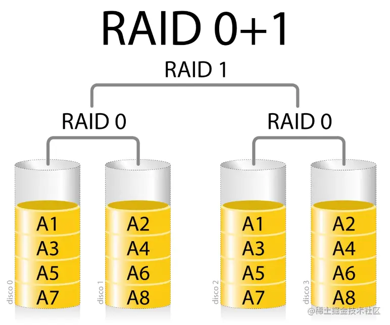 - RAID 0+1:通过镜像实现数据的冗余备份,使用条带化的方式将数据分散存储在多个磁盘驱动器上