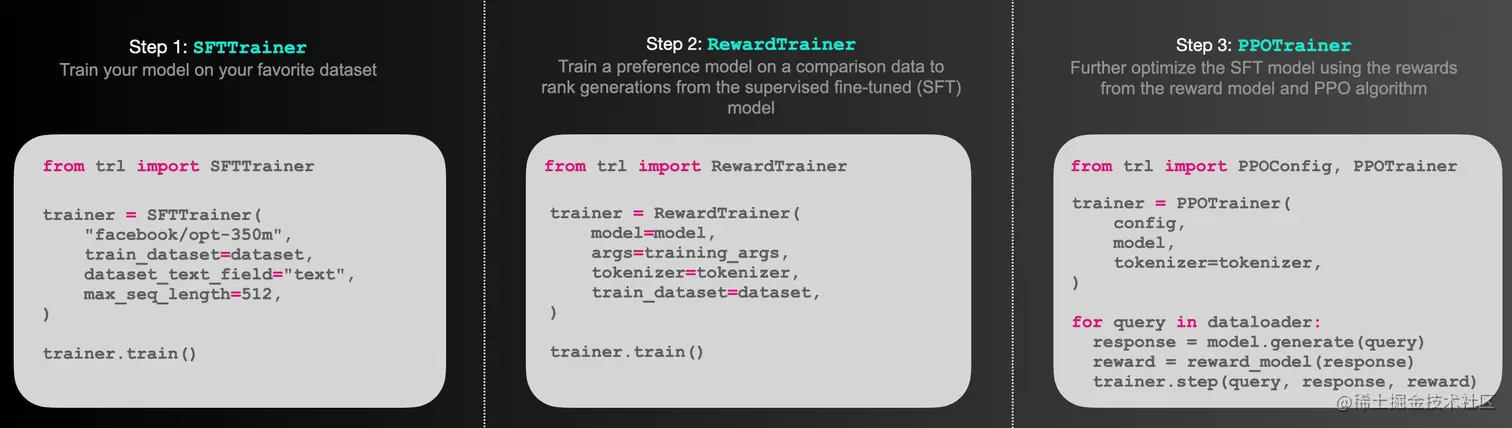 我们正式向大家介绍 TRL——Transformer Reinforcement Learning。这是一个超全面的全栈库,包含了一整套工具用于使用强化学习 (Reinforcement Learning) 训练 transformer 语言模型。从监督调优 (Supervised Fine-tuning step, SFT),到训练奖励模型 (Reward Modeling),再到近端策略优化 (Proximal Policy Optimization),实现了全面覆盖!并且 TRL 库已经与 🤗 transformers 集成,方便你直接使用!
