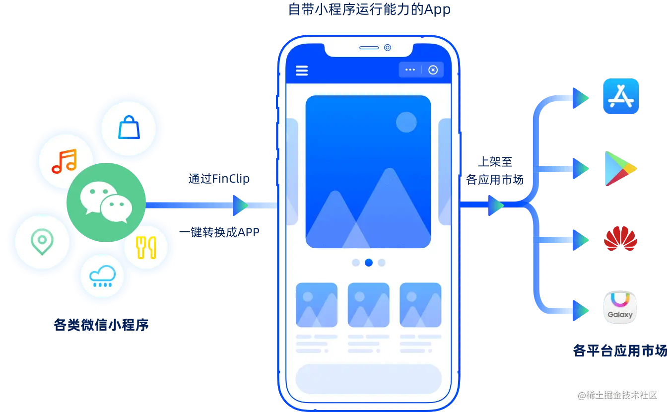 同时,它还支持 小程序一键转换成 App,可以将已有小程序代码导出为 IOS 与 Android 中可用的工程文件,并上架至各应用市场 。由于导出的工程文件自动集成了 FinClip SDK ,所以直接拥有小程序的运行能力,后续可在这个 APP 上继续上架更多小程序,自建自己的小程序生态。