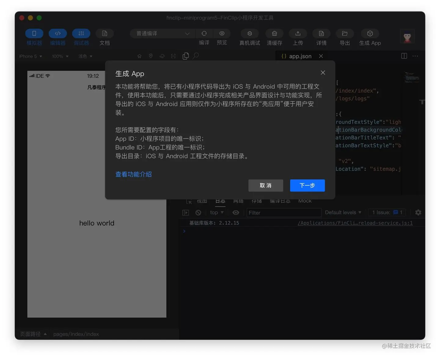那继续介绍一下 FinClip Builder ,FinClip Builder 界面与微信小程序的开发工具类似,自带调试和真机预览,简单易上手。
