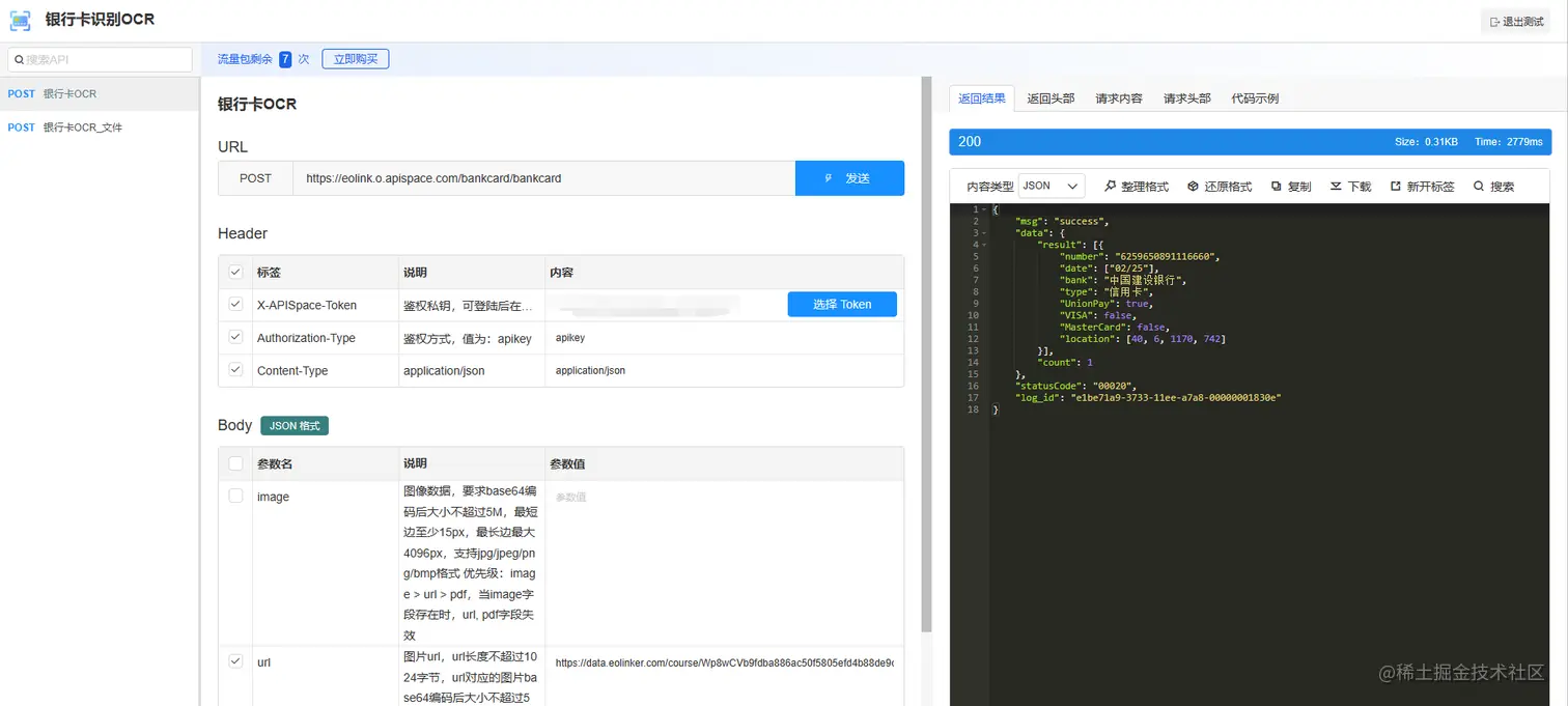 注册登录 APISpace,进入 【银行卡识别OCR】详情页,申请免费次数。