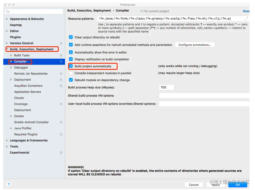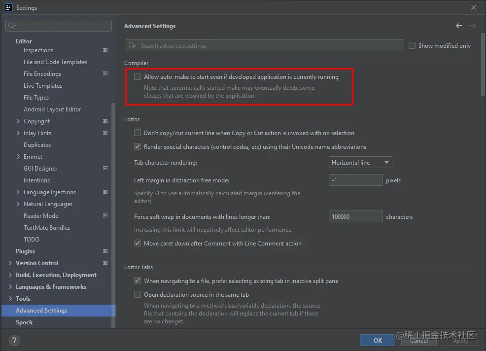很多文章介绍IntelliJ IDEA开启热部署功能都会写到在IntelliJ IDEA中的注册表中开启compiler.automake.allow.when.app.running选项,此选项在IntelliJ IDEA 2021.2之后的版本迁移到高级设置中。
