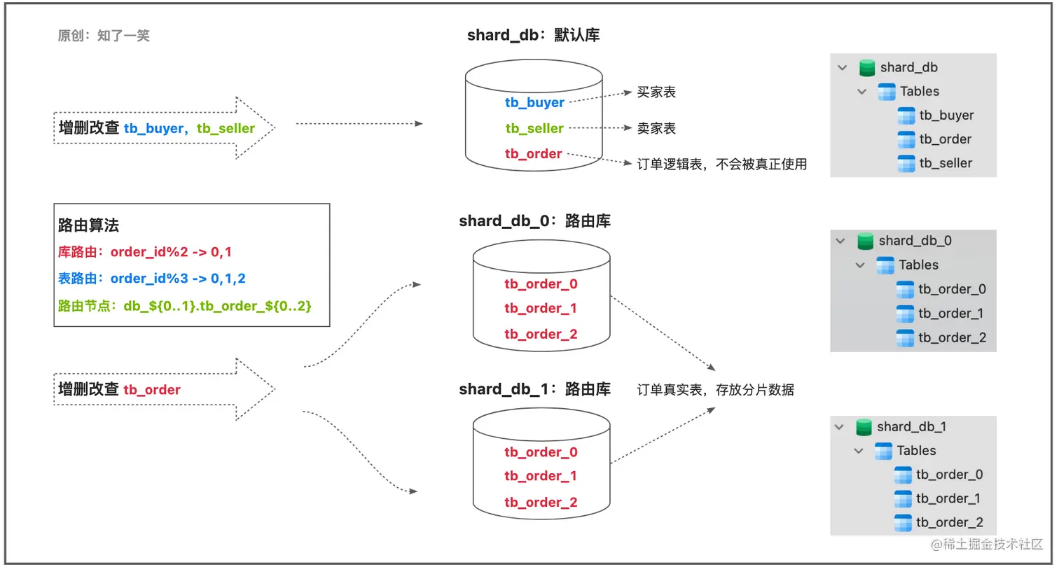逻辑表tb_order整体使用两个数据库,每个库建3张结构相同相同的表,在操作tb_order数据时,会根据order_id字段值定位数据所属的分片节点;