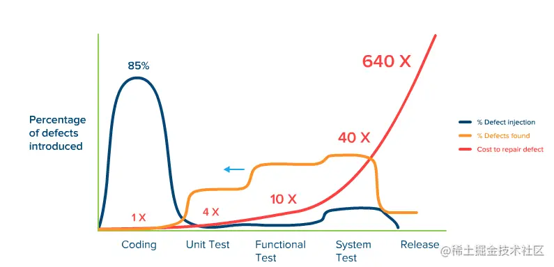 根据下图可见,从编码阶段、单元测试阶段、接口测试阶段、集成测试阶段、预发布阶段等软件生命周期中,越早发现问题,付出成本越小。