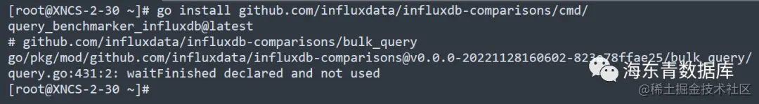 我学着开发同学在Github上寻找代码复制粘贴的姿势(我说的一定不是我司同学阿伟!),去寻找时序数据库领域有没有类似于关系型数据库的benchmarksql的性能测试工具,且能够支持某数据库协议。很快就发现了comparison工具,但它没有提供二进制下载,这不是啥问题,作为学过几天编程的我,编译安装Go程序还是很擅长的,于是熟练的敲下go install,但是却......