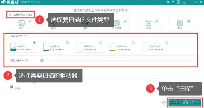 2.当看到主界面出现后,如果有指定需要扫描的文件类型,可单独选择;如果没有,勾选所有文件类型会得到更理想的扫描结果,并选择需要扫描的驱动器后单击 【扫描】 ;